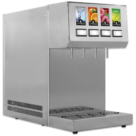 UNIQUE BAR 4 je připojen na vodovodní řád nebo na barel s vodou. Koncentráty se stáčí do hygienického a ekologického balení Bag-in-Box, které šetří místo a usnadňuje manipulaci. Stroj je připojení do 230 V zásuvky.