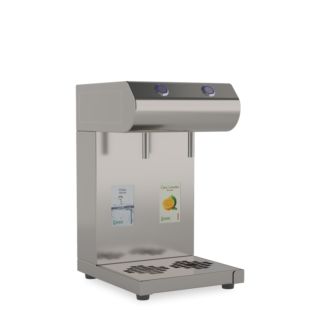 UNIQUE BAR 2 S má 2 výstupy pro výdej nápojů. Je připojen k vodovodnímu řádu nebo k barelu s pitnou vodou. Výdejník je připojen do zásuvky 230 V. Koncentráty jsou umístěny v Bag-in-Boxech umístěných pod úrovní stroje (skříňka, pult atd.)